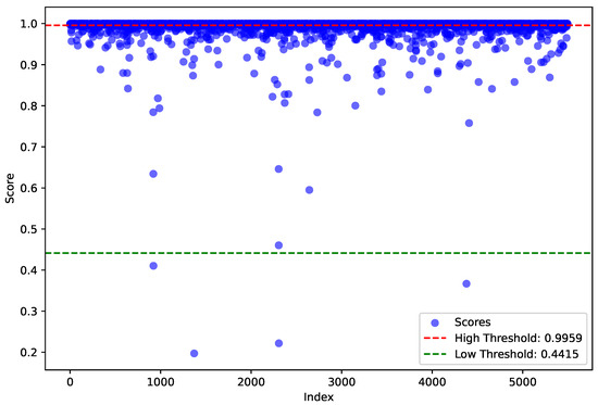 Next, we sequentially input each scene of the unlabeled samples and its corresponding weak augmentation into the teacher network. Using the newly obtained multi-class adaptive matching degree thresholds from Algorithm 1, we preliminarily screen out the scenes that meet the conditions. We add these scenes to the excellent pseudo-label set , as shown in the Equation (9):