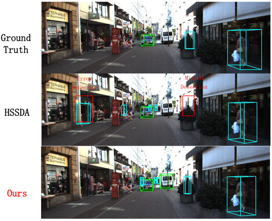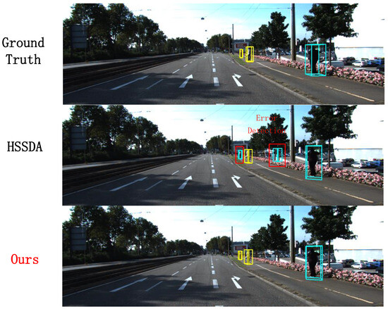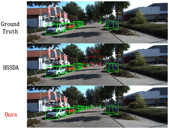 In this section, we visualize the results of the proposed method and compare them with the baseline model and ground truth boxes. The 3D detection results from the point cloud are projected onto 2D images for a more intuitive display. And the reasons for the superior performance of the 1% labeled data are also discussed. In Figure 8, our method successfully detects a pedestrian that the baseline model missed, as well as correcting the false detection of a distant small cyclist target. In Figure 9, our method not only successfully detects the vehicles identified by the baseline model but also accurately detects multiple distant small vehicle targets.In Figure 10, our method successfully detects a pedestrian missed by the baseline model. These visualizations demonstrate that, besides performing well on conventional and short-range targets, our proposed method also enhances detection performance for distant small targets. This is achieved by using multi-modal information as supplementary data and employing a multi-class adaptive threshold strategy to generate dynamic thresholds.