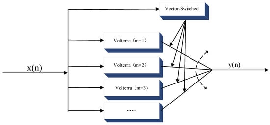 The nonlinear behavior model serves as the cornerstone of digital predistortion techniques [3,4,5,6], with numerous memory nonlinear models derived from the Volterra series having been proposed. Among these, the Memory Polynomial (MP) model features a straightforward structure that effectively compensates for nonlinear distortion [7,8]; however, its linearization performance in wideband and high peak-to-average power ratio (PAPR) input signal scenarios is somewhat lacking. Conversely, the Generalized Memory Polynomial (GMP) model addresses this limitation by incorporating additional cross terms with varying memory depths, enabling it to provide effective predistortion correction for wideband and high PAPR signals [9]. The Vector Switched (VS) model has been introduced to enhance the efficiency of power amplifier architectures [10], but the number of parameters required escalates exponentially with the number of segments used. A novel technique for identifying the parameters of a digital predistorter, termed Iterative Learning Control Digital Predistortion (ILC-DPD), has been developed by J. Chani-Cahuana, demonstrating better linearization performance compared to indirect learning architecture (ILA) and direct learning architecture (DLA) [11]. Additionally, C. Kantana has proposed an auto-tuning approach designed to optimize the performance of dual-input Doherty power amplifiers, maximizing power efficiency while adhering to linearity specifications [12]. Me ngozzi M. introduced an automatic parameter-setting method utilizing coordinate descent or Bayesian optimization to enhance power addition efficiency while maintaining appropriate linearity for wideband modulated signals [13]. For more complex linearization scenarios, such as envelope tracking (ET) systems where the amplifier drain voltage fluctuates dynamically with the input signal’s envelope, the inherent nonlinear characteristics are intensified even as efficiency is improved [14]. In [15], a Piecewise Dynamic Deviation Reduction (PDDR) model based on the Volterra series has shown promising performance when applied to ET systems. Furthermore, G. P. Gibiino has proposed a real-time inversion algorithm for the two-input behavioral model of supply modulated RF power amplifiers, enabling accurate linearization of the envelope tracking power amplifier in real-time settings [16].