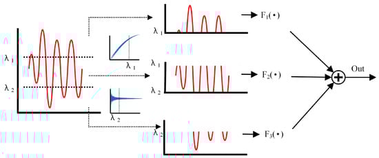 where x(n) is the complex form of the input I/Q signal, |•| is the absolute value taken on the complex number, i.e., the amplitude of the input signal, FM(•) is the nonlinear fitting function for the Mth interval, M is the number of segments, λ is the threshold of the segments, the commonly used F(•) denotes the polynomial, MP, and DDR models, etc. [8,15,18,19].