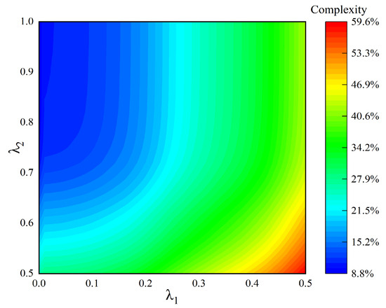 As shown in Figure 5, the computational complexity of the parameter extraction of the CPMP model relative to the GMP model under different thresholds is shown. When λ1 decreases and λ2 increases, the number of sampling points using the GMP model to extract parameters gradually decreases, and the complexity of parameter extraction gradually decreases. Similarly, when λ1 increases and λ2 decreases, the complexity of parameter extraction gradually increases. Since the proposed CPMP model is based on the MP model, the GMP model reuses part of the MP coefficients. Therefore, the minimum complexity is to use the MP model parameter extraction operation for all sampled signals, that is, there is no GMP model for parameter extraction; the highest complexity is the sum of the parameters extracted by the cross term of the GMP model after the MP model is used to extract the parameters of all the sampled signals.