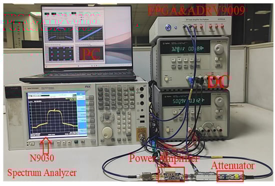 In order to verify the performance of the CPMP model proposed in this paper, we carried out experimental verification. The experimental test uses a digital radio frequency experimental platform, as shown in Figure 8. The baseband signal is generated by the PC side and downloaded to the FPGA. After up-conversion by ADI’s RF sub-board ADRV9009, it is input to the power amplifier. The output signal of the power amplifier returns to the digital radio frequency experimental platform through the attenuator, showing the spectrum and constellation diagram of the signal.