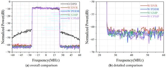 The corresponding ACPR and EVM are given in Table 6. The experiment results show that the ACPR of the CPMP model is improved from −36 dBc to −54 dBc, which is 0.5 dBc higher than the PDDR and DVR model, which is comparable to that of the GMP model. Also, there is no significant difference in the EVM.