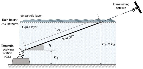 The downlink from a satellite to a user terminal (UT) under stratiform rain conditions is illustrated in Figure 1. The satellite signal passes through two layers: the top ice particles layer (IPL), primarily consisting of ice as dry frozen particles, and the bottom liquid layer (LL), marked by liquid-phase precipitation, separated by the rain origin height at , equal to the 0 °C isotherm at . While the former has negligible contribution to the attenuation, the latter has a pronounced effect on the received signal UT at altitude and elevation angle from the horizon. Signal quality is conveyed by the signal-to-noise ratio (SNR), which is the power ratio C of the useful signal to the noise power N over bandwidth B, both assessed at the receiving antenna. In particular, the signal quality is given by the average energy per symbol received at radio frequency (RF) relative to the noise power spectral density , known as energy-per-symbol-to-noise density ratio (ESNDR) and noted as /.