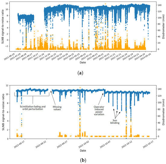 (a) Time series of the SNR ratio from the SLNB in the Rome location (blue dots, left axis) and the associated disdrometer rain accumulation measurements (orange crosses, right axis). (b) Same view, detailed on a single-month time range and with indications of observed satellite downlink impairments.