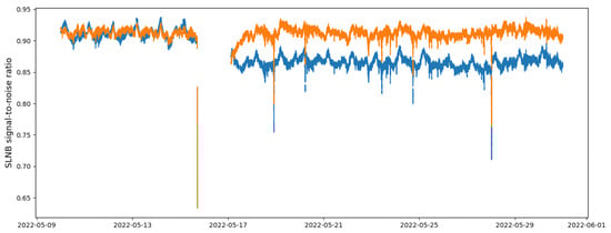 - Missing value imputation. Most intervals with missing values were short, and we used linear interpolation with neighboring values to impute them. We applied this imputation only during non-rain instances to avoid introducing significant bias during concurrent rain events. Linear interpolation was chosen because the SNR remains constant in the absence of rain events, making it suitable for estimating missing values during these periods. Furthermore, interpolation was applied only for brief interruptions in the SNR data (maximum of 5 min); longer periods were left empty and not considered in the training data to prevent potential distortions. Given the short duration of the missing intervals and the stable nature of the SNR during non-rain periods, linear interpolation provided a simple and effective solution with minimal bias introduced;