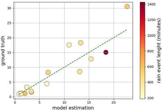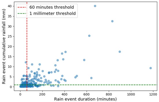 Our selection criteria resemble the ones used in [], where a minimum cumulative rainfall of and a minimum duration of 60 min were used as thresholds. Figure 4 shows the selection process using these criteria, showing an evident linear relationship between cumulative rainfall and event duration. In our data, numerous events with duration under 60 min are associated with cumulative rainfall exceeding . Conversely, events with cumulative rainfall below reveal a much more fuzzy relationship between the two variables.