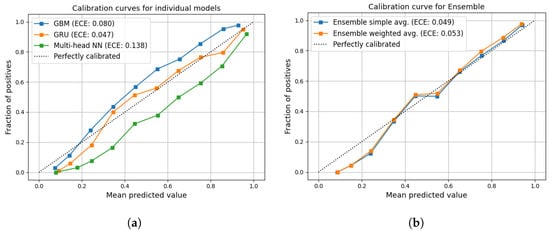 Calibration plots of the best performing models. (a) GBM, GRU and MH-NN models. (b) ensemble model, with both simple and weighted averages.