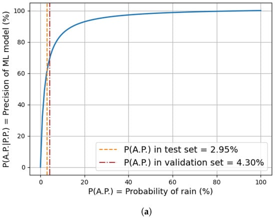 The performance obtained using our best performing model, the ensemble classifier on the test set, is reported in Table 7. This test dataset has a higher imbalance () with respect to that of the validation set, due to the fact that this time frame included mostly the summer months with less precipitation. The results are in line with those obtained on the validation dataset. Finally, in Figure 6, we show the behavior of the Precision performance with respect to the actual probability of observing a rain instance. Precision is a class-balance sensitive metric since it is computed by conditioning on predicted positives. This conditioning negatively affects Precision in cases of high imbalance. Indeed, applying the Bayes theorem to the Precision metric, we obtain