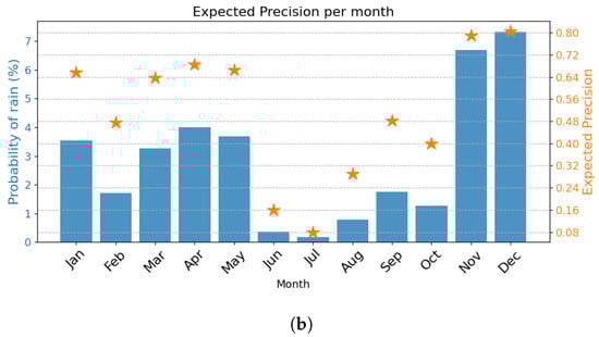 where AP and PP represent the actual positive and the predicted positive events, respectively. Stated otherwise, the lower the probability of observing a positive instance, the lower the value of , which results in a lower Precision value . Using historical data, we then calculate the expected month-by-month probability of observing a rain event. By plugging these probabilities into (13), we can obtain the results shown in the bottom plot of Figure 6, which displays the monthly probabilities along with the expected Precision of the ensemble model over the course of the year. The probability of rainfall ranges from as low as in July to nearly in December.