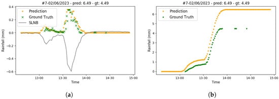 In addition, in order to have a more direct and readable assessment of the results, we also adopted an additional assessment method and compared the cumulative predictions from the regression model with the actual cumulative rainfall for any given rain event in order to assess the error rate on the cumulative precipitation amount on a given rain event. For the latter, assessment metrics include linear correlation coefficient and normalized bias (NB).
