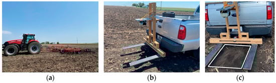 Case IH Magnum 380 row crop tractor equipped with (a) Case IH Tiger-Mate 255 Field Cultivator; (b) a pickup truck mounted with SICK LiDAR sensor (LMS 511-10100 PRO SR) (Minneapolis, MN, USA) and on the wood reference frame for data collection; and (c) seedbed surface designated for SICK LiDAR scanning area (0.77 m wide and 0.83 m long).