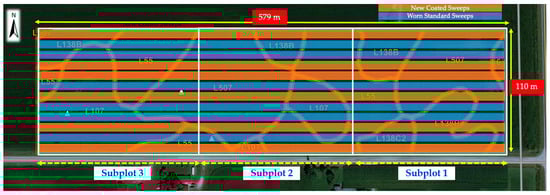 We investigated the effects of two tillage tools on seedbed quality by using new and worn cultivator sweeps on field cultivator equipment, Case IH Tiger-Mate 255 Field Cultivator (Racine, WI, USA) pulled by Case IH Magnum 380 row crop tractor (Racine, WI, USA) (Figure 1). A tillage operation was conducted using a Completely Randomized Design (CRD) in six replicates of the new and worn cultivator sweeps. Each replicate consisted of field cultivation performed by the Case IH Tiger-Mate 255 Field Cultivator, one with a set of new coated cultivator sweeps and the other with a set of worn cultivator sweeps. Each of the tillage treatment field plots was divided into three subplots, each measuring 189 m by 110 m for data sampling. The experimental field (579 m long by 100 m wide) layout for the three subplots and the two tillage treatments in six replicates is shown in Figure 2.