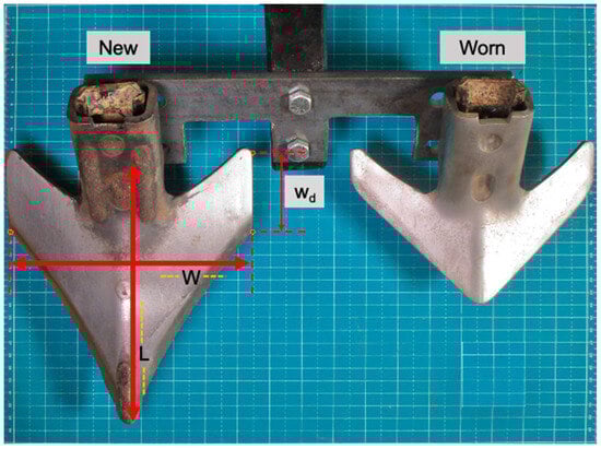 Geometric dimensions (sweep length (L), sweep front width (W), and wing depth (wd)), as shown in Figure 3, are measured using a measuring tape (1 mm resolution) on fifty-seven cultivator sweeps from each of the new and worn cultivator sweeps. The new cultivator sweeps are commercially available as Maxxi-Point Field Cultivator Sweep from Case IH equipment manufacturer (Racine, WI, USA). On the Maxxi-Point Field Cultivator Sweep, CADEN Edge coating was applied to the bottom base of the cultivator sweep using tungsten carbide welding to the base of the cultivator sweep, as explained in [], and are commercially available as Case IH Extenda-Wear products of Agrisolutions (Hamilton, ON, Canada). Case IH provided the fifty-seven worn Case IH Maxxi-point field cultivator sweeps after conducting field wear testing using the Case IH Tiger-Mate 255 Field Cultivator equipped with new Case IH Maxxi-point cultivator sweeps. Tillage tool wear during field cultivation on agricultural soils is caused by low-stress abrasive wear from the soil-to-tool interaction [].