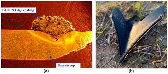 A cross-section of the CADEN Edge coating fused to the base sweep (a) and the CADEN Edge-coated polished and etched cultivator sweep (b).