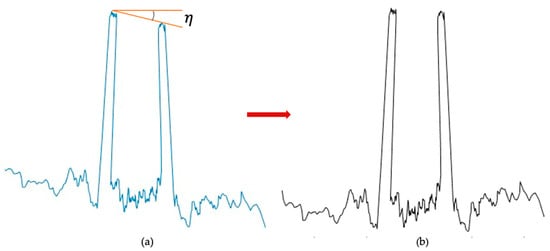 The stationary LiDAR scans were analyzed to reconstruct 2D and 3D seedbed surfaces and generate statistical measures of the soil roughness attributes. A MATLAB (MATLAB R2023a, Natick, MA, USA) script was used to produce a soil profile for evaluating soil roughness. Each LiDAR scan consists of 380 points ranging from 5° to 175° (at an interval angle of 0.5°). Data correction was performed in two steps as follows: (1) adjusting for tilting of the LiDAR sensor measurement system due to the wheeling the pickup truck on tilled soil and (2) obtaining the LiDAR data of the seedbed surface height in reference from the two wooden plates close to the tilled soil surface. As the LiDAR sensor and the wooden frame setup are mounted on the back of the pickup truck, there is a potential chance that the pickup truck is slightly tilting due to the truck wheeling on tilled soil surfaces and natural soil relief surfaces (Figure 5a). Correction to the tilting allows to adjust the LiDAR-scanned data to nearly zero angle in the horizontal plane between the two black painted wooden plates (Figure 1). The schematic diagram for correcting LiDAR-scanned data due to tilting (η) is illustrated in Figure 5, showing a sample LiDAR-scanned profile before correction (Figure 5a) and after correction (Figure 5b).