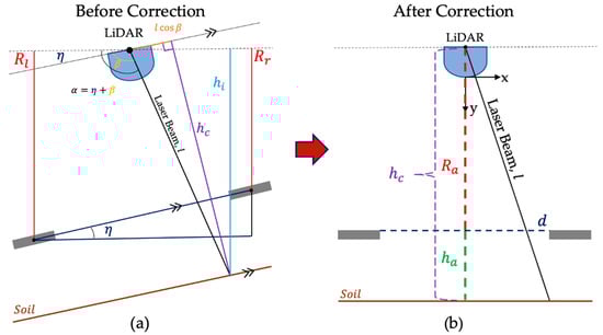 Step 1: Calculate the actual vertical height from the LiDAR sensor to the data points that include reference plates and soil surface corrected by using Equation (1) as follows: