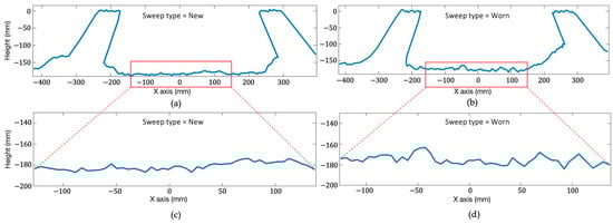 Sample cropped cross-sectional 2D seed bed LiDAR profile from the new coated sweep (a) and (b) worn sweep tillage treatments. The sample pair of cropped seedbed profiles of (c) the new coated sweep and (d) worn sweep tillage treatments.