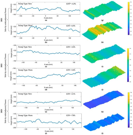 A sample pair of 2D scans of new coated sweep (a,c,e) and worn sweep (b,d,f) tillage treatment from side-by-side passes and 3D representation scans of new (g,i,k) and worn (h,j,l) tillage treatment with COV* (coefficient of variation) above from each experimental year (from 2021 to 2023).
