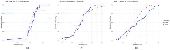 CDF (cumulative distribution function) plot of mean soil heights (or depths) from new (blue line) and worn (red line) cultivator sweeps from 2021 (a), 2022 (b), and 2023 (c).