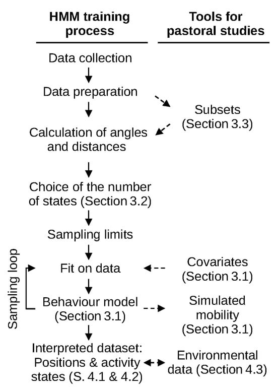 GPS data were prepared and cleaned using the Herds Activity Mapping and Analytical Classification (HAMAC) routine, developed for the purpose of this study. The complete and reproducible code is available at https://gitlab.cirad.fr/selmet/hamac (accessed on 15 October 2024) [7]. The HAMAC routine is written in the R statistical programming language (v. 4.3.3) [20], relies on the moveHMM package (v. 1.9) [21], for several key features and makes extensive use of parallel computing for data processing. The HAMAC routine includes tools to wrangle, clean and format data, prepare and combine data from multiple sources, train and explore HMMs and generate diverse figures and metrics on the model and final dataset. It requires two datasets. Firstly, a table of time-stamped GPS readings with the collar ID, latitude, longitude, the GPS sensor dilution of precision (DOP; not strictly required) and the recorded temperature is required. Secondly, a metadata table, containing the periods during which each animal was fitted with each collar and information about the herd and the farmer is required.