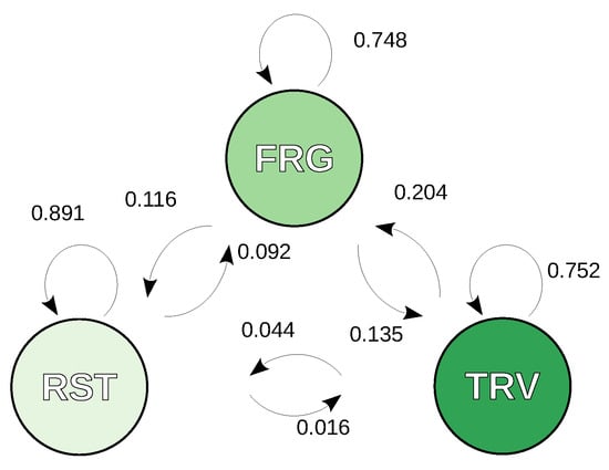 Figure 2 is a schematic representation of the matrix of transition probabilities between states for each time step. All states are accessible from one another and fairly stable, with about a three in four chance every 30 min of remaining in foraging and travelling states and almost a 90% chance of resting to last, reflecting relatively long streaks of the rest state in the dataset. The transition from resting to foraging (research and intake) is significantly more likely than the transition to travelling. Leaving a travelling state, on the other hand, leads to foraging five times more often than to resting. Leaving a foraging state can lead equally to resting or travelling. The initial-state distribution matrix, of no relevance to our discussion but necessary to reuse the model, is the following: , in the order: resting, foraging, travelling.