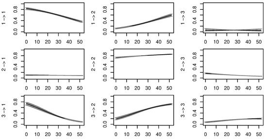 Transition probabilities between states as a function of the temperature recorded by the collars (°C) and confidence intervals. 1: resting, 2: foraging, 3: travelling.
