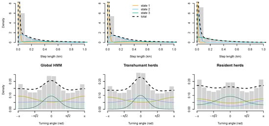 Distributions of trajectories length (grey histogram top) and angles (bottom), with density of probabilities for their emission for each state and the total, for the whole dataset (global hidden Markov model–HMM; left), transhumant herds (middle) and resident herds (right). Step length abscissa (top) is artificially truncated to 1 km for readability purposes.