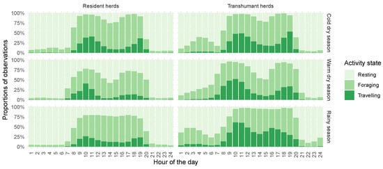 Temporal distribution of activity states by hour of the day, categorized by herd type and season. Cold dry season: November–February, warm dry season: March–May, rainy season: June–October.