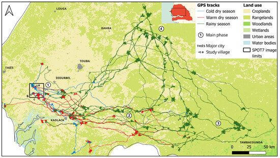 Full (31 months) GPS tracks for 14 transhumant herds, coloured by season, geographic extent of the SPOT land cover dataset (1.5 m resolution) and location of the home villages and main transhumant phases, displayed over land-use data from the Globcover dataset (300 m; WGS84). Home villages: a: Barry Sine, b: Diohine, c: Sob; phase numbers are referred to in the text.