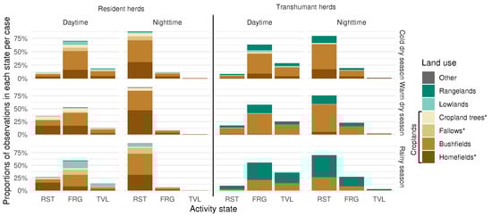 Repartition of GPS fixes per activity state coloured by landscape unit, for each season, herd type and for day and night. RST: resting, FRG: foraging, TVL: travelling; cold dry season: November–February, warm dry season: March–May, rainy season: June–October. Daytime and nighttime relative to sunrise and sunset each day. Water bodies are included into lowlands, dwelling areas are included into homefields, other land uses cover gardens and roads. Cropland units with an asterisk are a feature exclusive to the home area map, and the Globcover dataset encompasses them under the unit bushfields.