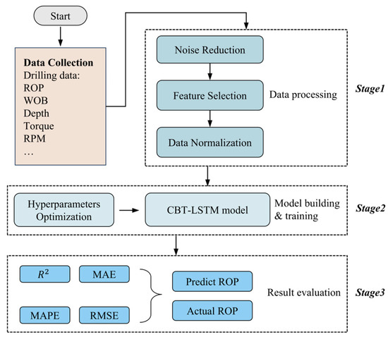 The remainder of this paper is structured as follows. Section 2 provides a detailed description of the research methodology and the architecture of the CBT-LSTM model. Section 3 outlines the general steps involved in ROP prediction, including data preprocessing, the construction of the sliding window, and the model evaluation metrics. Section 4 presents the selection of hyperparameters for the CBT-LSTM model, a discussion and analysis of the experimental results, and highlights the limitations and directions for future research. Finally, Section 5 summarizes the paper and presents the conclusions.