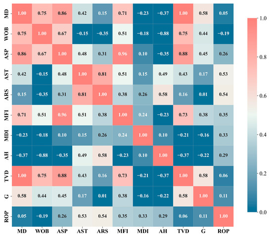 First, the Pearson correlation coefficient [37] was used to assess the linear correlations between various features and the rate of penetration (ROP). The range of the Pearson correlation coefficient r is [−1, 1], where a positive r indicates a positive correlation and a negative r indicates a negative correlation. According to the results shown in Figure 8, parameters such as AST, ARS, MFI, and MDI exhibit strong correlations with ROP, and are thus selected as input features. However, though MD, WOB, ASP, AH, TVD, and G have lower correlation coefficients, this does not imply that their influence on ROP is insignificant. They may affect ROP indirectly or through interactions with other factors, making it necessary to further analyze their nonlinear relationships.