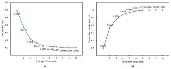 As shown in Figure 9, the first six principal components (PC1 to PC6) account for 98.68% of the total variance in the dataset. In contrast, the remaining four PCs account for only 1.32%. Therefore, the original 10-dimensional dataset (with 10 variables) can be reduced to a 6-dimensional dataset without significant information loss.