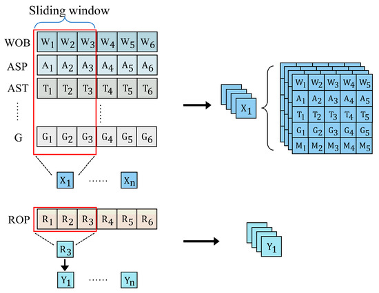 In this study, the sliding window technique is employed to process drilling data, preserving the temporal characteristics of the data and fitting the input layer of the 2D convolutional neural network (CNN). The size of the sliding window determines the number of data points at each time step, enabling the model to capture the relationships between preceding and subsequent data points in the sequence, thus improving the accuracy of time series prediction. As illustrated in Figure 10, the sliding window moves over both feature variables and target variables.