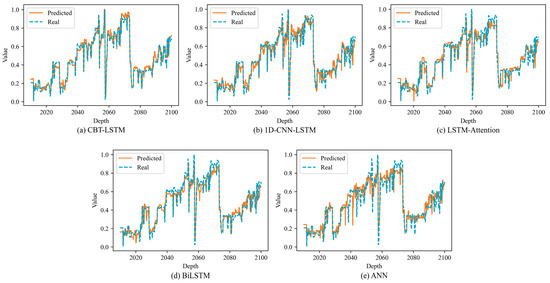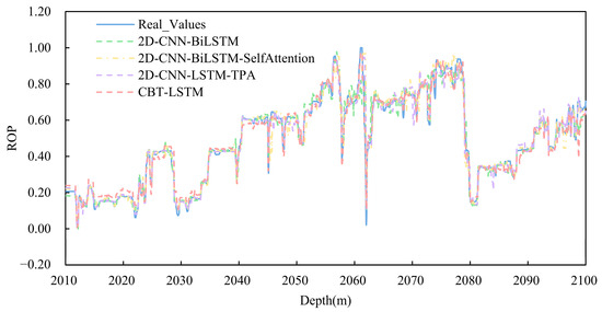 The superior performance of the CBT-LSTM model can be attributed in part to its use of a sliding window, which transforms the time-series data into a 2D structure, enabling the 2D-CNN to capture temporal–spatial relationships more effectively than other models. This model achieved the lowest MAE, RMSE, and MAPE, and the highest R2, indicating its ability to accurately predict ROP with significantly improved accuracy compared with other neural networks. Considering the evaluation of all results, the CBT-LSTM model demonstrates superior performance across all evaluation metrics, further proving its practicality in ROP prediction.