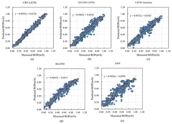 Relationships between the predicted ROPs and the measured ROPs of five models: (a) CBT-LSTM; (b) 1D-CNN-LSTM; (c) LSTM-Attention; (d) BiLSTM; (e) ANN.