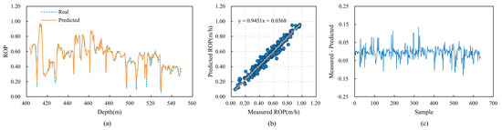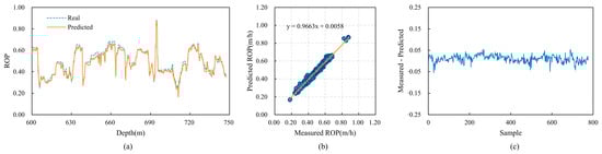 The predictive performance of CBT-LSTM on Well D. (a) Comparison between real ROP and predicted ROP. (b) Cross-plot of real ROP and predicted ROP. (c) Relative error between real ROP and predicted ROP.