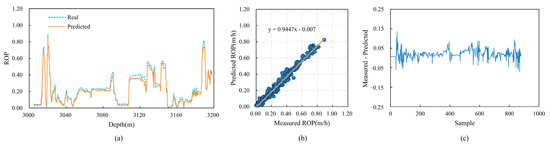 The predictive performance of CBT-LSTM on Well B. (a) Comparison between real ROP and predicted ROP. (b) Cross-plot of real ROP and predicted ROP. (c) Relative error between real ROP and predicted ROP.