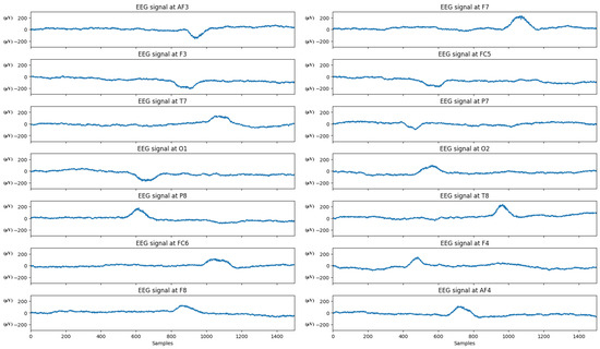 The EEG signals (processed) collected from the test participants in the experiment, with units in V.