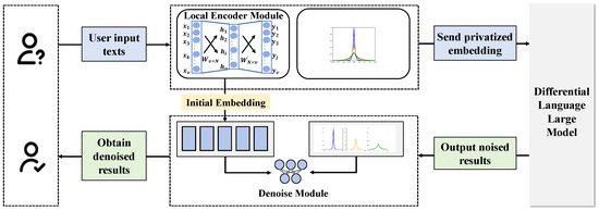 This figure depicts the structure and data flow of the overall model, demonstrating the process from user text input to the differential LLMs, including the local encoding module, denoising module, and the output of results, comprehensively showing the detailed steps of system information processing.