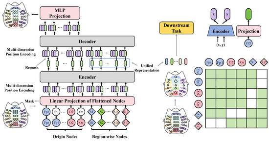 This figure illustrates the detailed architecture of the EEG fusion module, from encoding to decoding the signal, showing how EEG signals are transformed into a unified representation for downstream tasks through multidimensional positional encoding and regional node processing.