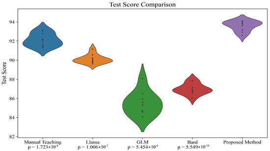 The primary objective of this experiment is to evaluate and compare the effects of different teaching methods in language learning, particularly between automated teaching models and traditional manual teaching. The data in Table 5 are calculated from the averages of 200 participants to ensure sample representativeness and data robustness. The specific averaging method is as follows: taking this study’s method as an example, as referenced in Table 3, we sum the test scores from Group A under the “Sports” theme, Group B under the “Travel” theme, Group C under the “Food” theme, Group D under the “Shopping” theme, and Group E under the “Health” theme, and then divide by 200 to obtain the average score.