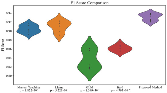 In order to investigate the minimal differences in results among the various models presented in Table 5, a more detailed statistical analysis was conducted to further explore this phenomenon. Initially, while the performance differences between the models in terms of precision, recall, accuracy, and F1-score might appear slight, these differences are statistically significant. To verify the statistical significance of these differences, t-tests, a common statistical method for comparing the mean differences between two data groups, were implemented. The experiment compared the performance differences between manual teaching methods and our proposed automated language learning teaching assessment system based on EEG and differential LLM, as well as differences within the system models themselves. This approach allowed us to not only test whether the performances of various models were statistically significant but also to verify if our system could achieve the expected enhancement in teaching outcomes when applied in practice. Specifically, we calculated the average performance metrics of each model across different test sets, as shown in Table 2, and conducted paired t-tests, as shown in Table 6 and Table 7 and Figure 7 and Figure 8. Each group in Table 6 and Table 7 has only 10 rows of data because the test for all participants included ten items, as shown in Table 2.
