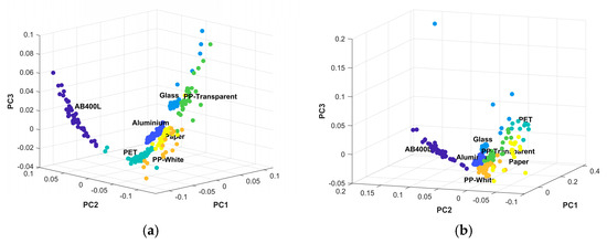 Figure 5 illustrates the clustering results of the KNN-based classification model, which is based on the first three principal components that together account for 95% of the variance in the dataset. The analysis of the six dataset PC clusters indicates that materials such as AB400L and glass are well separated, suggesting that PCA effectively captures the differences among these materials and can distinguish them from others. However, some overlap is observed primarily among PP white and transparent, which are closely clustered due to their similar spectral characteristics, as they are made from the same base material. Additionally, instances where PET clusters closely with paper, PP transparent, and aluminum further illustrate the challenges in classification. Despite this overlap, the figures clearly show that all materials are distinctly separated and can be easily classified, demonstrating that PCA components are valuable for classifying materials effectively.