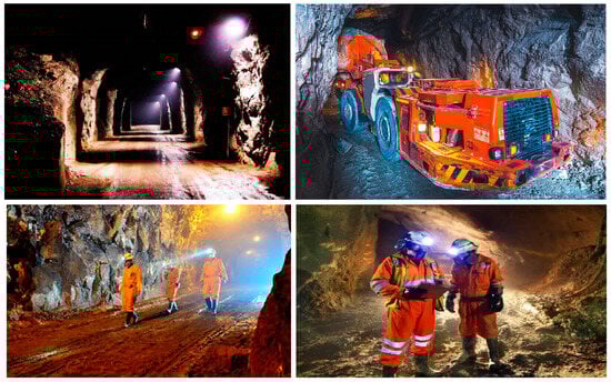 For example, each underground mine is unique considering the exploitation method selected to extract the minerals, where the main methods considered worldwide are as follows: (i) chambers and pillars, (ii) sub-level stopping; (iii) sub-level caving, (iv) block caving, and (v) subsidence, among others. Thus, each of the exploitation methods considers various activities, such as, for example, among the most important, (i) drilling, (ii) blasting, (iii) ventilation (entry of fresh air and extraction of toxic gases and dust), (iv) loading of ore, (v) hauling or transporting ore and mine waste rock material, (vi) removal of groundwater, (vii) providing services, electricity input, and radio communication, (viii) and support installation (bolts anchoring, shotcrete, and wire mesh), among others [2,3,4] (See Figure 1).