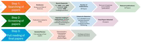 Finally, the following content structure was defined to communicate the main ideas of this review: Chapter 1: Introduction, Chapter 2: Literature review, Chapter 3: Comparison of Different Technologies for Wireless Monitoring in Underground Mine Environments, Chapter 4: Underground Mine LoRa Wireless Monitoring System, Chapter 5: Discussion of Results, and Chapter 6: Conclusions.