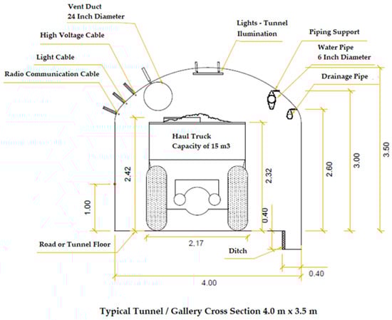 Figure 4. Typical tunnel/gallery cross-section in a conventional underground mine with the use of cables. All units are in meters. Adapted from [20]. - Radio communication (non-conventional wireless system): these systems allow communication at anytime, anywhere, and on any device. Their advantages include (i) simultaneous communication to several receivers and (ii) the capacity to transmit early community warnings [42].