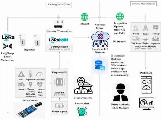 - Singh, A.; Kumar, D.; Hötzel, J. IoT Based information and communication system for enhancing underground mines safety and productivity: Genesis, taxonomy and open issues. Ad Hoc Netw. 2018, 78, 115–129. [Google Scholar] [CrossRef]