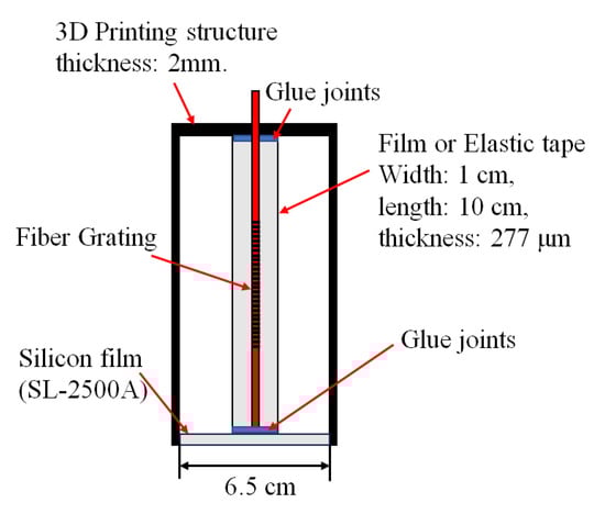 For the design of the sensor structure, since the natural resonance frequency of the structure itself is fixed, if the resonant cavity structure is fabricated to amplify the signal amplitude, it may be limited by the vibration wave of a specific frequency or due to the compressibility of the air to cause the vibration wave to be absorbed. Therefore, the design of the film squeeze structure mainly refers to the traditional load-bearing extrusion method of piezoelectric sensors. During the vibration process, the piezoelectric material is deformed by the squeeze of the weight and the process of generating electrical signals. The sensing mechanism of these proposed fiber sensors is based on the grating wavelength shift caused by the vibration signals from the speaker. The speaker acts as a vibration signal source to create the vibration signals to drive the elastic silicon thin-film to result in the spontaneous vibration of the thin-film for stretching and depressing the sensing fiber grating to cause the grating wavelength shift. The configuration of the operating mechanism for this sensor is shown in Figure 1. This idea is to combine the fiber grating with the special structure-packaged design. Firstly, the fiber grating is embedded in a silicone rubber film with a thickness of 277 μm, and then the film is cut into strips along the axial direction of the grating. The silicone rubber film is made by utilizing a mixture of SL-2500A (agents A and B) (Chih Yi Bussiness Company, New Taipei, Taiwan). For each batch, agents A and B are mixed in a 10:1 ratio. The prepared solution is poured into the center of a circular iron plate with a diameter of 10 cm and placed in a spin coater. The spin coater uses centrifugal force to evenly distribute the silicone rubber solution across the iron plate. By adjusting the amount of silicone rubber solution or controlling the speed and duration of the spinning process, films of different thicknesses can be produced. A 3D printing technique is used to print a circle that is closed on one side. One end of the fiber grating is passed through the circular film, and finally, the whole is fixed to the cylindrical structure using silicone adhesive (3M Silicone Adhesive PN08019, 3M, Maplewood, MN, USA). In this way, the bottom film can be aligned with the vibration source, and through the upper and lower resonance effect of the bottom film. The central vertical film will be stretched and compressed to cause the grating to be strained and then to result in the grating center wavelength shift. By measuring the grating wavelength shift, the vibration signals can be obtained. From the experiments, the elastic tape (3M Polyester Tape 8901, 3M, Maplewood, MN, USA) has nice tensile and elastic effects for better frequency response. The film fiber grating is fabricated by a fiber grating embedded with an elastic film to compare the sensing performance between the two different sensors.